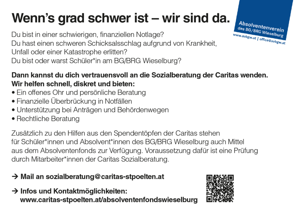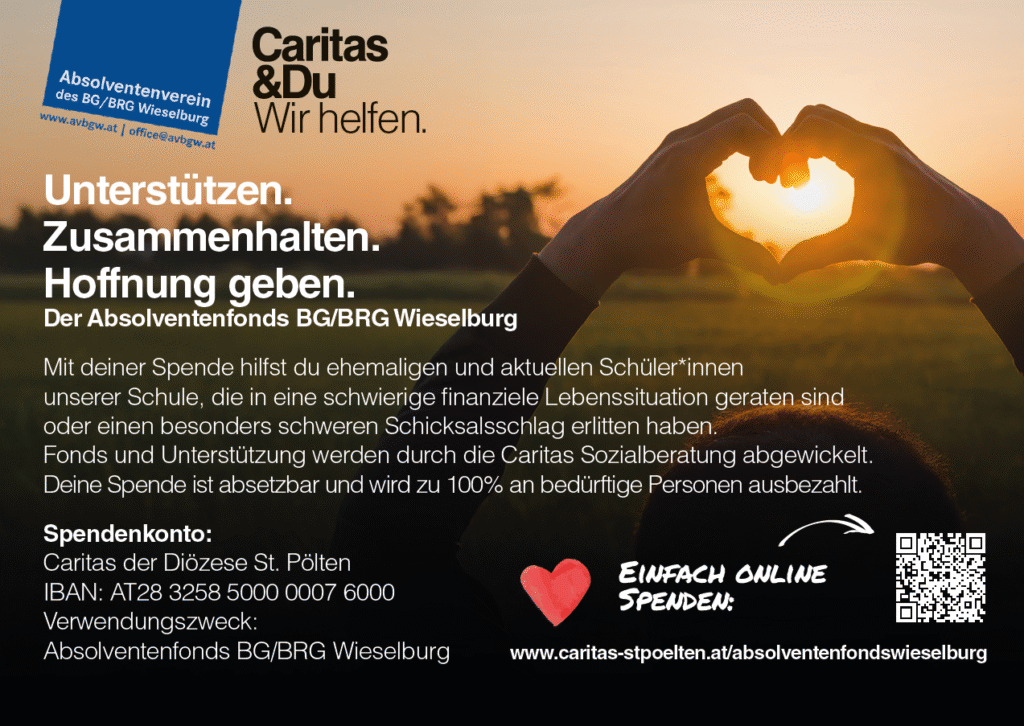 Mit deiner Spende hilfst du ehemaligen und aktuellen Schüler*innen unserer Schule, die in eine schwierige finanzielle Lebenssituation geraten sind oder einen besonders schweren Schicksalsschlag erlitten haben. Fonds und Unterstützung werden durch die Caritas Sozialberatung abgewickelt. Deine Spende ist steuerlich absetzbar und wird zu 100% an bedürftige Personen ausbezahlt.